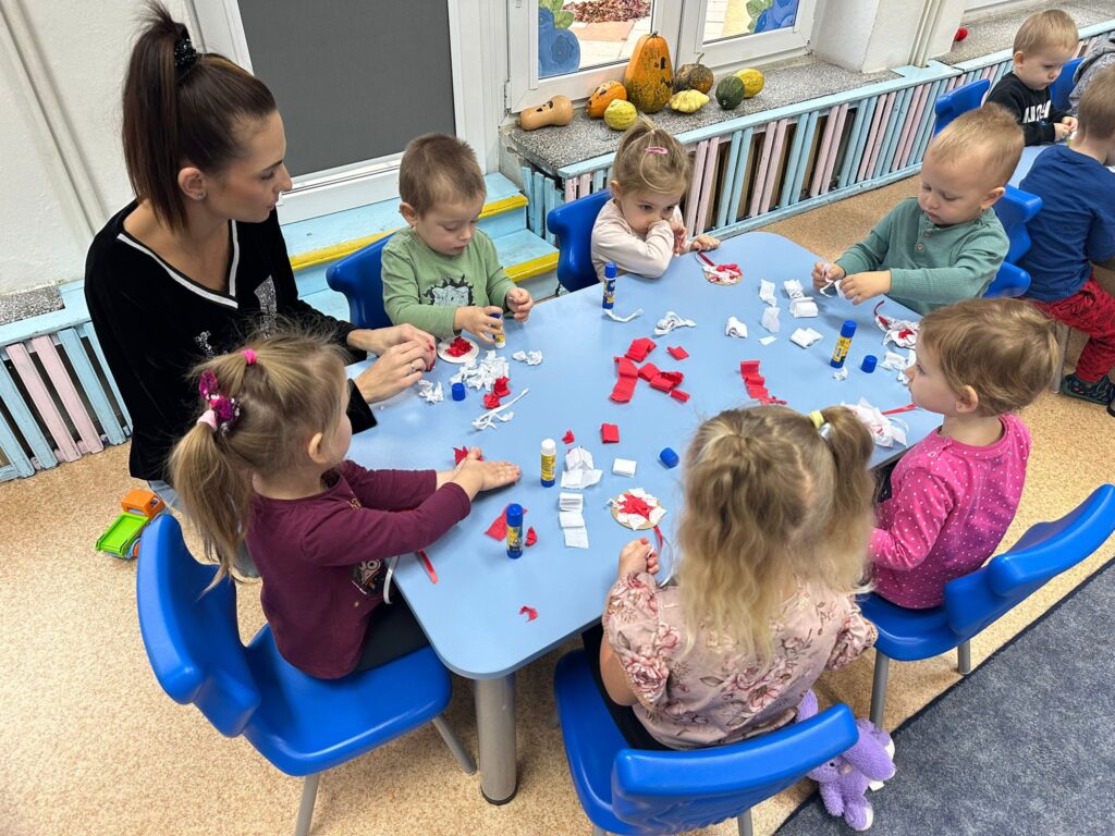 Po lekturze przyszedł czas na kreatywną część – wspólnie wykonaliśmy kotyliony z bibuły, które przedszkolaki z dumą zabrały do domu!