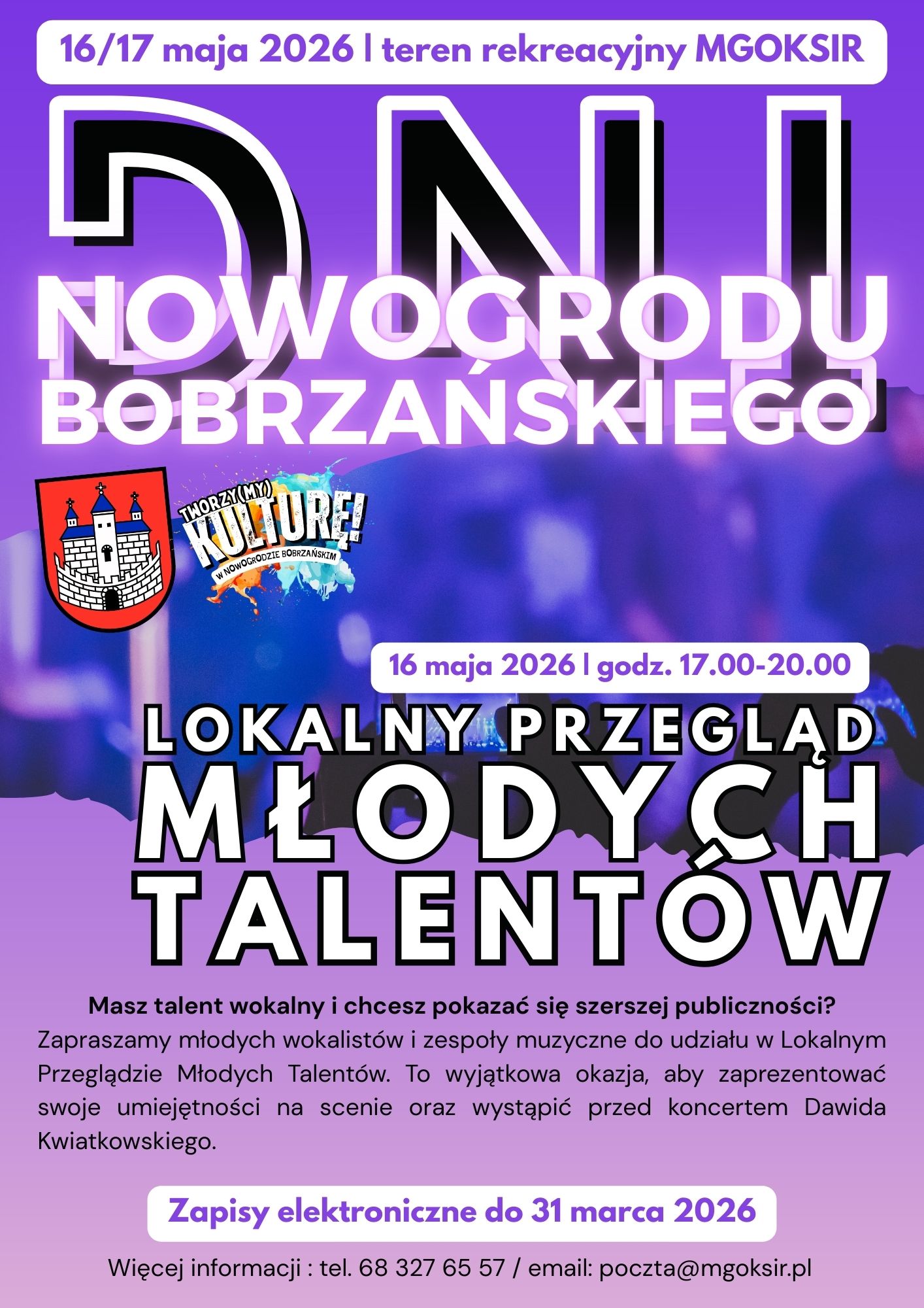 Podczas Dni Nowogrodu Bobrzańskiego 2026 dajemy scenę młodym artystom! Już 16 maja w godz. 17.00–20.00 odbędzie się Lokalny Przegląd Młodych Talentów – wydarzenie, podczas którego młodzi wokaliści i zespoły muzyczne z naszej okolicy będą mogli zaprezentować swoje umiejętności przed publicznością! ![]()